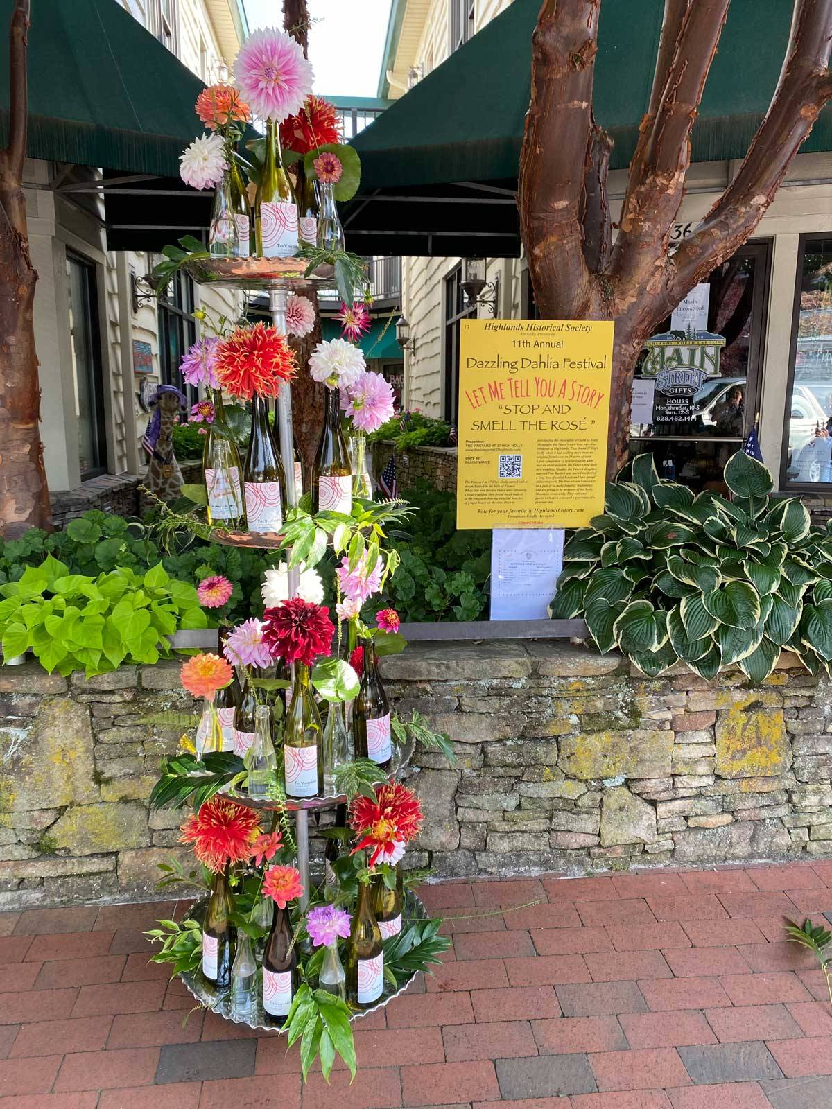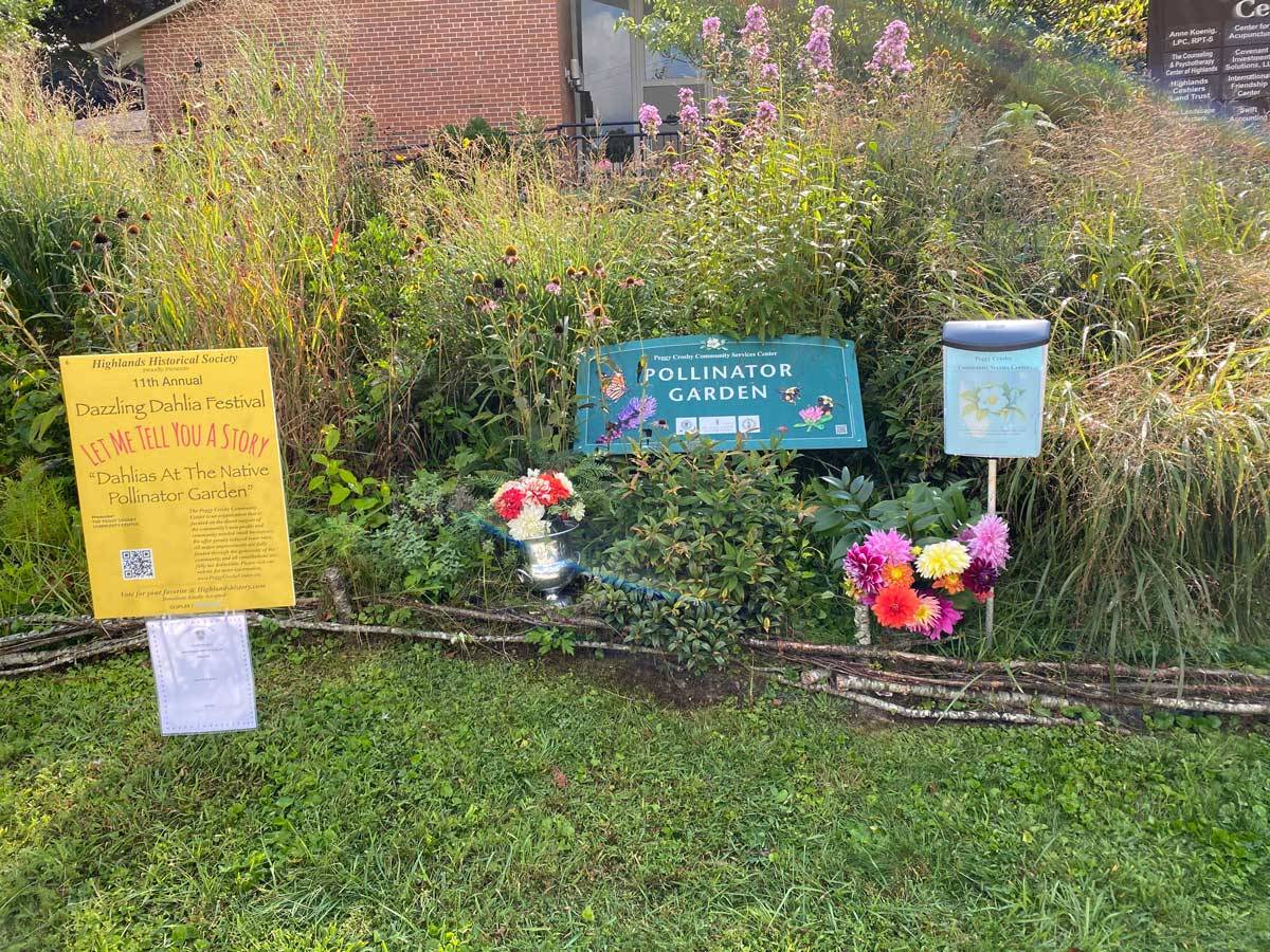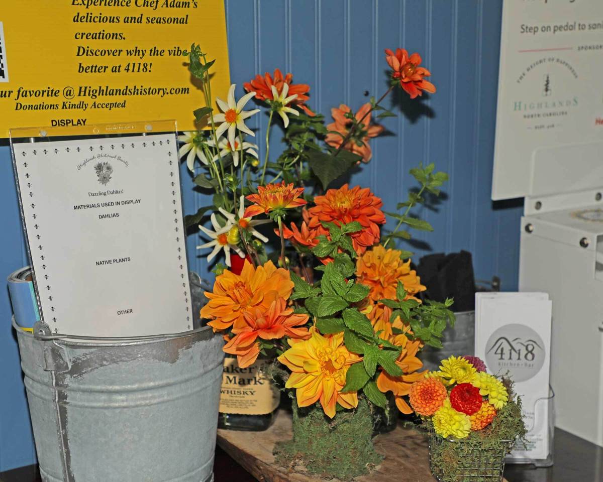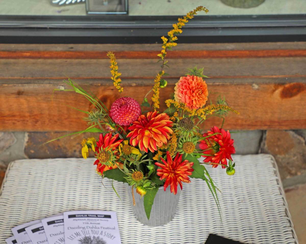 On Saturday and Sunday, September 11-12, Highlands became the backdrop for beautiful vignettes of dahlias and native plants. A trail map directed people to the displays. During the weekend, members of the public were encouraged to vote for the display they liked best. The voting closed at 5:30 pm on Saturday. This year there were 27 displays, as described below. Photos by Greg Clarkson.