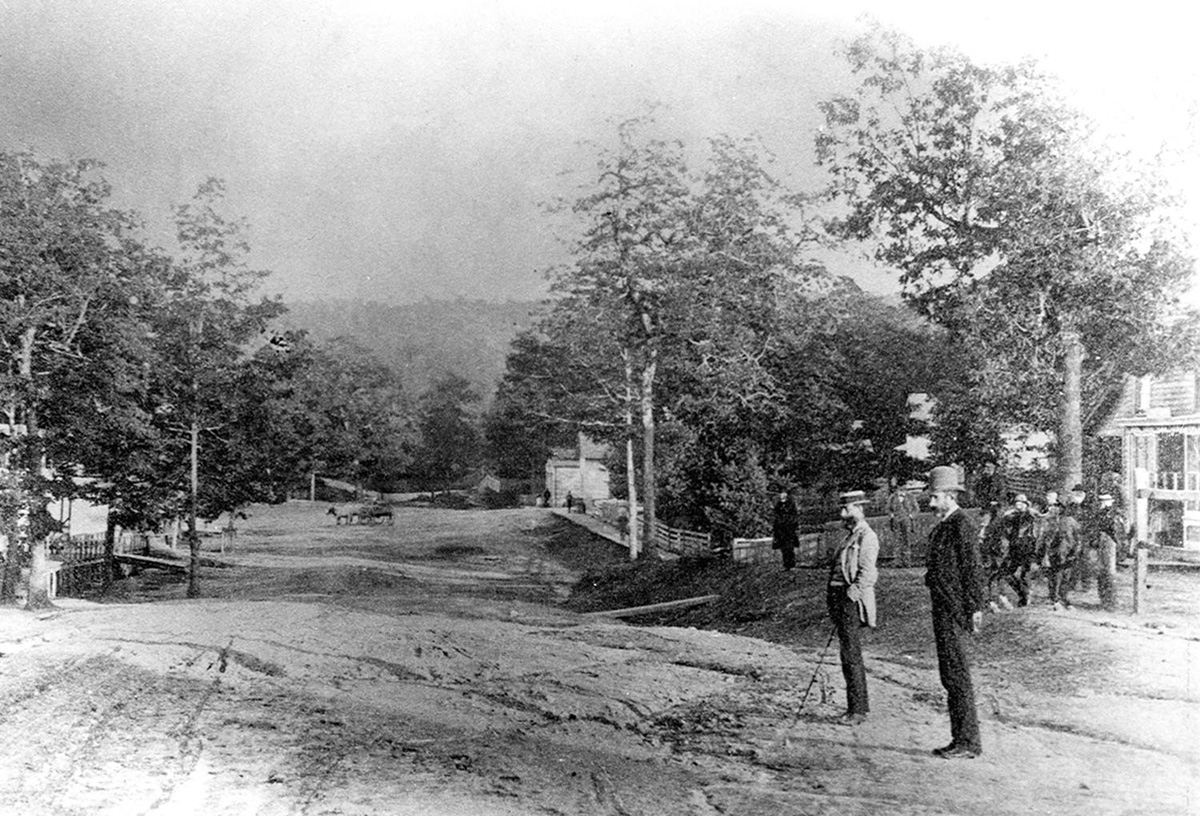 John Bundy took this photo of Main Street Highlands looking east from the 3rd Street intersection ca. 1884. To the right are T. Baxter White's home and post office, John Arthur's home through the trees, Annie Dimick's Cheap Cash Store, and C. L. Martin's Meat Market. Two well-dressed men in top hats stand out from a crowd of men. Baxter Wilson's store is on the left. Not visible are Highlands Inn on the far left and Central House on the far right.