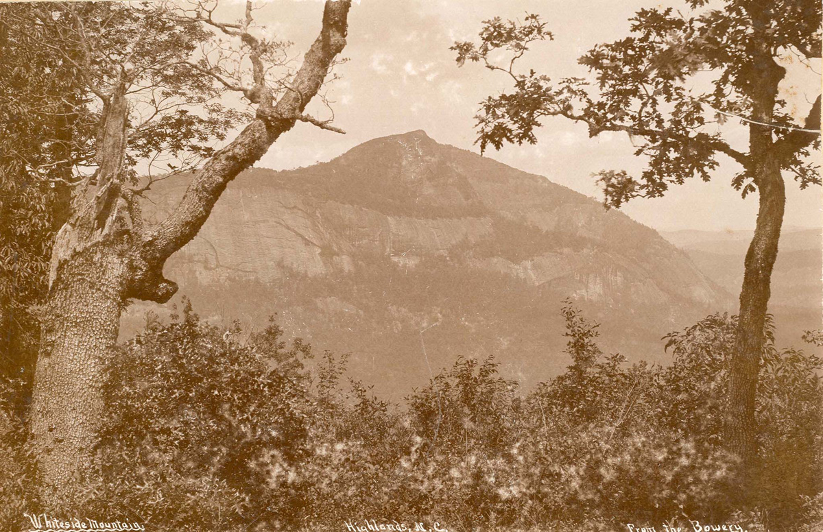This photo of Whiteside Mountain, as seen from the Bowery, is framed by 2 trees in sepia by Henry Scadin. It was taken ca. 1910. Whiteside's cliffs, ca. 1,800 feet, are the highest east of the Rockies.