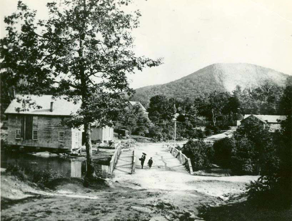 Mill Creek Bridge and pond, built in 1886 over John Jay Smill's mill dam at north 4th Street. Satulah Mountain stands in the background. Will Cleaveland's planing mill and office and Alexander "Alex" P. Alexander's home (later William Sullivan's), which was completed in 1909, are on the left. On the right is the first Highlands School, built in 1878 by Arthur House and replaced in 1919 by the Town Clock School on the hill. Photo by Henry Scadin in 1912.