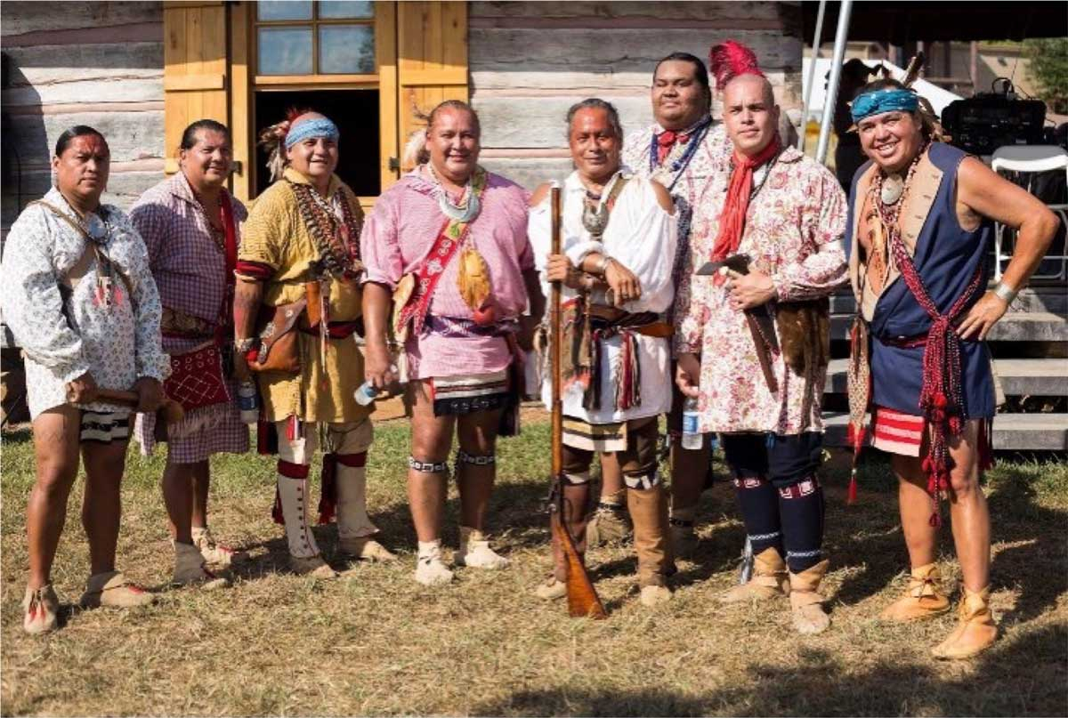 (Left to Right) Will Tushka, Daniel Tramper, Sonny Ledford, Ernest “Beaver” Grant, Bullet Standingdeer, Jarrett Wildcatt, Mike Crowe, Bo Taylor. Photo courtesy of the Museum of the Cherokee Indian.