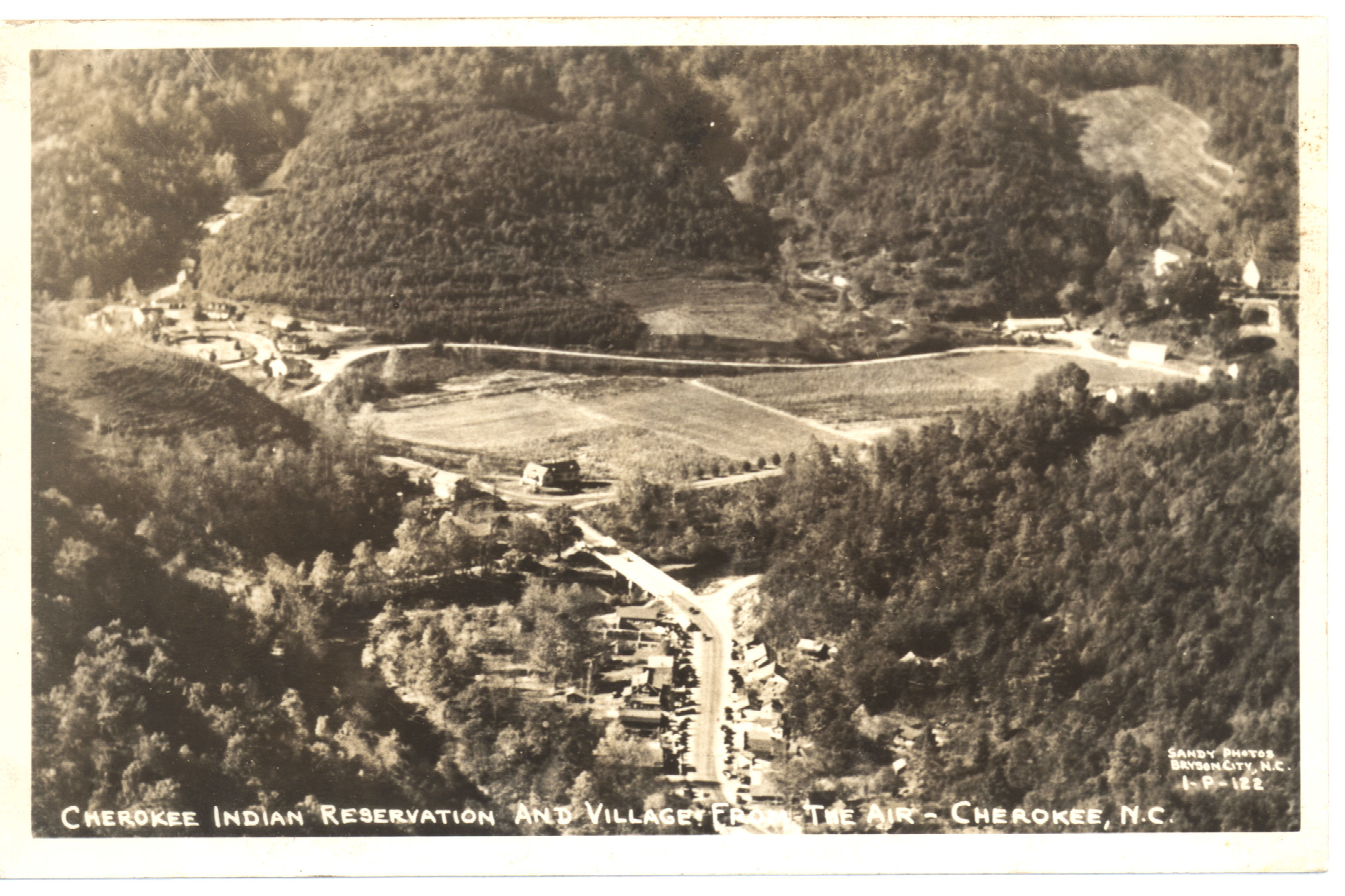 Cherokee River Valley: The town of Cherokee along the Oconaluftee River surrounded by the Great Smoky mountains in western North Carolina, circa 1949. Photo courtesy of Photo courtesy of the Collection of Hunter Library, Western Carolina University.