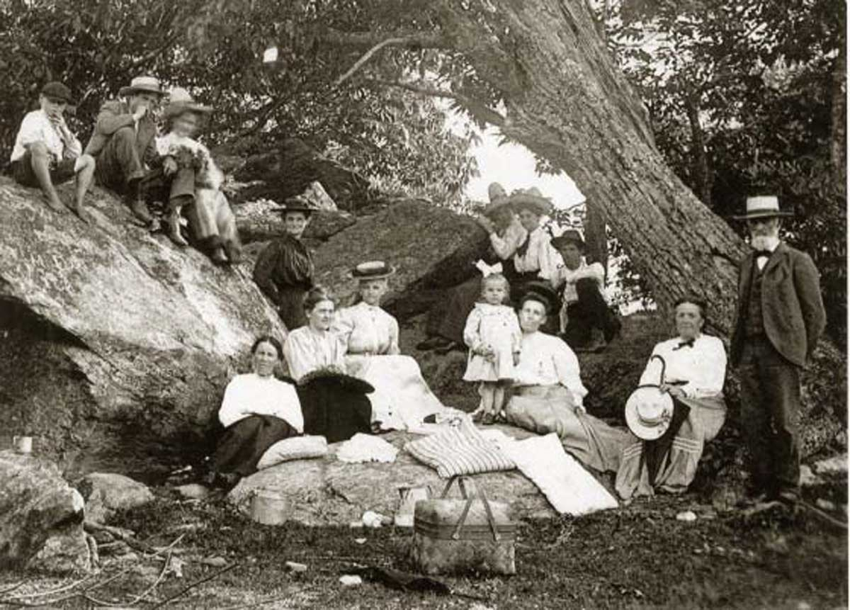 Like these in 1909 (right), would picnic among large rocks that circled the campground at the end of Kelsey Trail. On that fateful day in 1911, 13 friends went up to Whiteside. Photograph courtesy of Tammy Lowe.