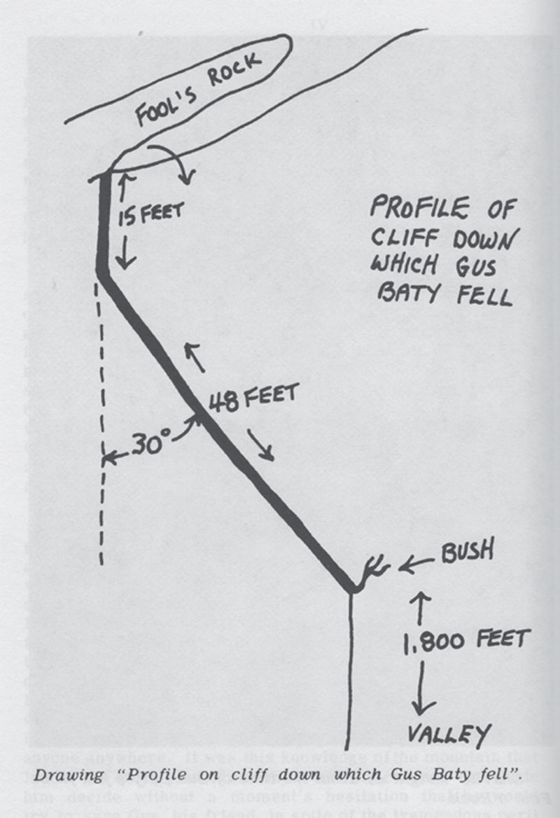 Suddenly, Gus tottered and fell off the rock. He shot like an arrow down a 30-degree slope to the brink of a perpendicular 1,800-foot precipice. Charlie Wright ran out on the rock and saw that a small rhododendron bush some 60 feet below had saved Gus from plunging to certain death.