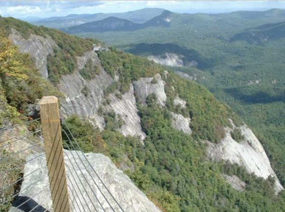 When Highlands was founded in 1875, there was no road to Whiteside Mountain. So in 1881 Samuel Kelsey began work on a wagon road that began at the north end of 5th Street and ended a quarter-mile from the top of Whiteside Mountain. Completed in 1883, the trail wound for 4½ miles through a forest lined with huge hemlocks. Photograph courtesy of Tammy Lowe.