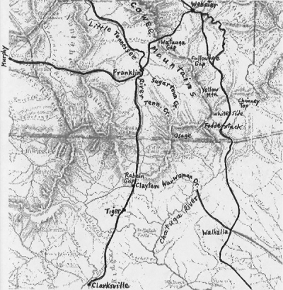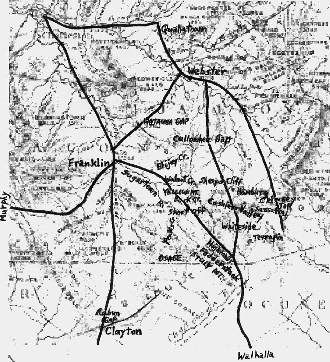 The road map of 1882 showed Franklin, Highlands; Osage, Fodderstack, Whiteside, and Yellow mountains; Stuly (Satulah) and Shortoff mountains; Buck Creek and Peeks Creek; the Sugartown River; and Cashiers Valley.