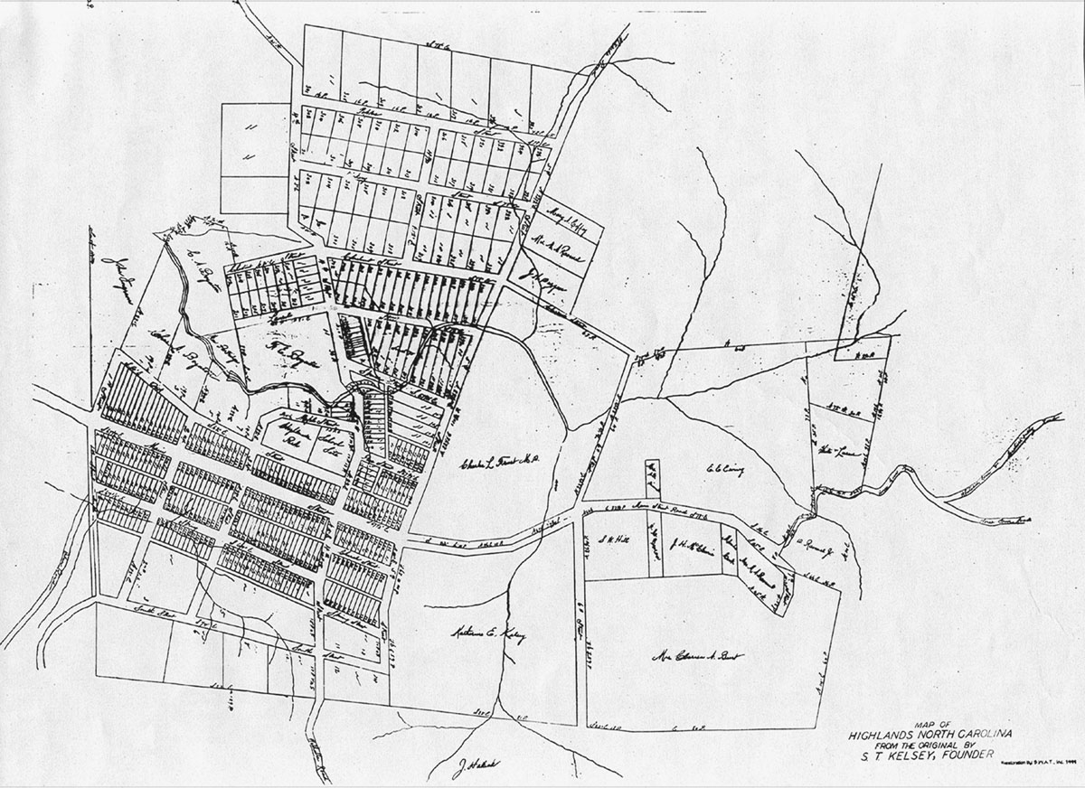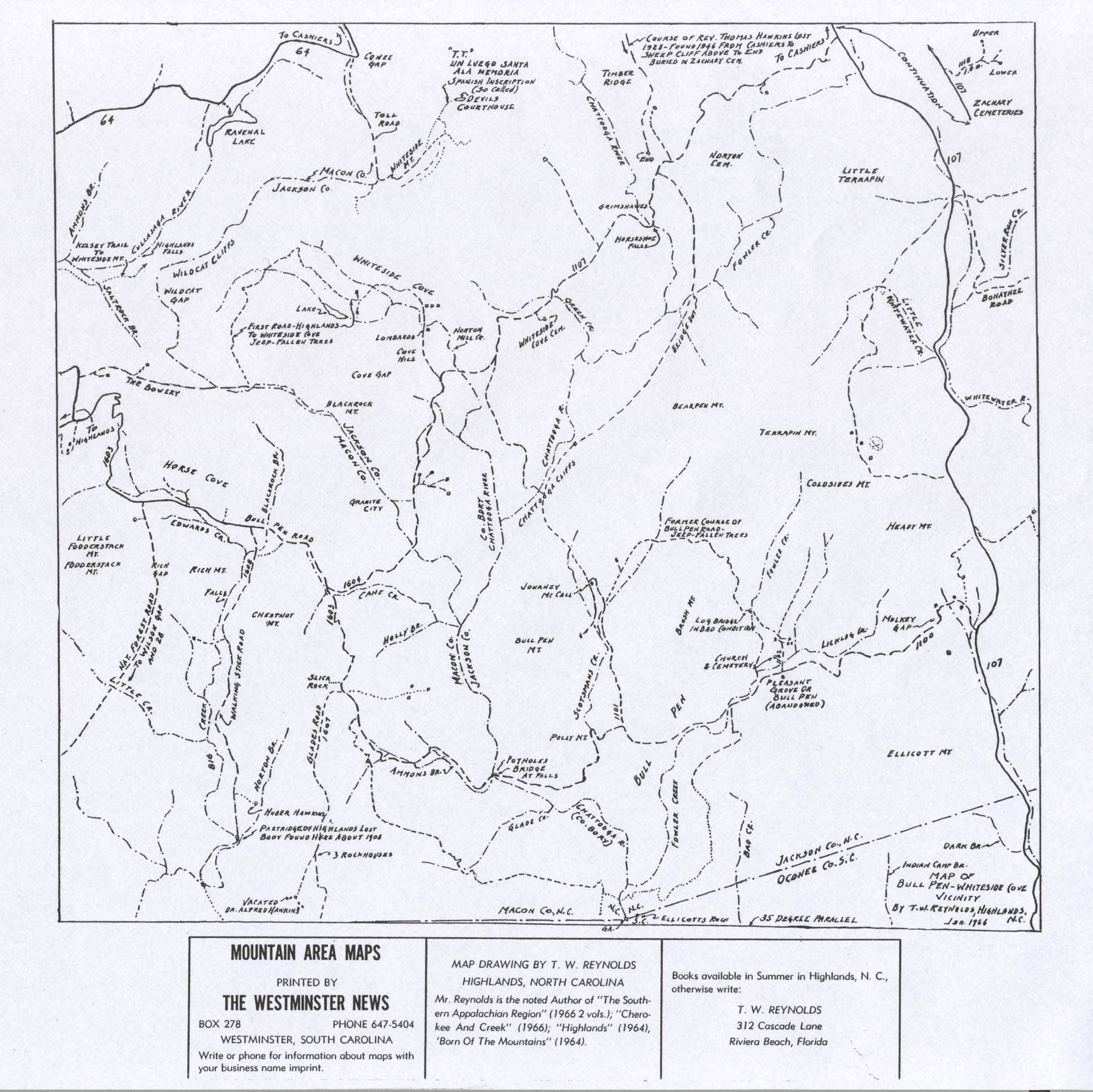 Two maps in 1966 were created by T. W. Reynolds, Highlands' first historian, showing all the roads, trails, and points of interest surrounding Highlands and Horse Cove, which he had discussed in his four books about the area. On the Highlands map he included a long list of odd names, such as Dirty John Creek, Lost Bridge, Screamer Mountain, Smash Wagon Ford, Misery Mountain, and Chunky Gal.