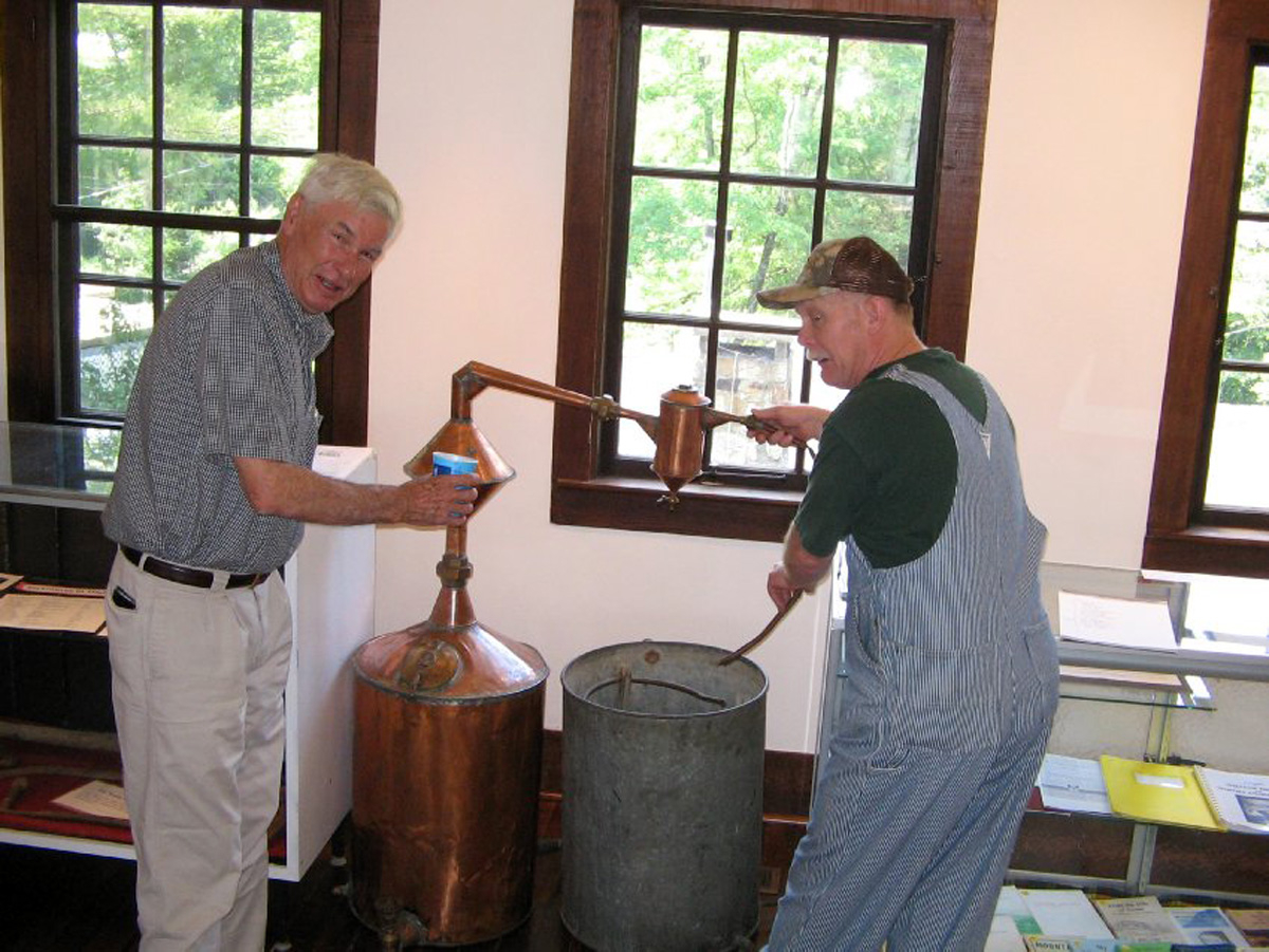 This moonshine still, on loan from John Schiffli at the Highlands Historical Museum, was purchased at auction in Georgia. The photo shows John Schiffli and Jim "Red" Potts repairing the connecting worm--or rather Red repairing and John begging. Photo by Randolph Shaffner.