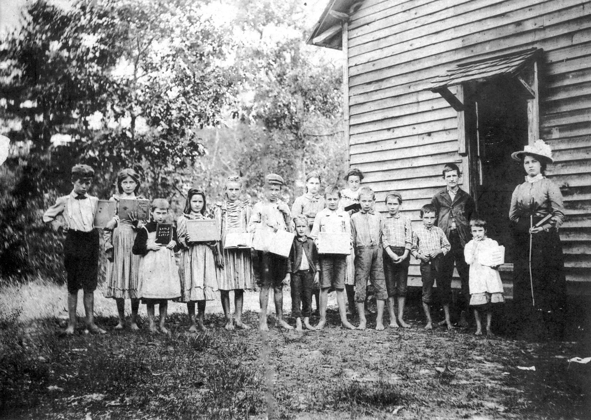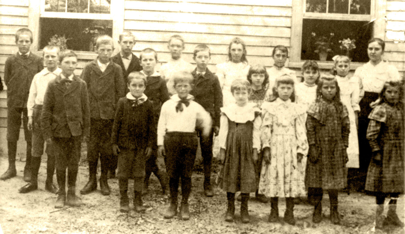 Front row from left: Ab Edwards, Arthur Griffin, George Cleaveland, Bessie Anderson, Nettie Reese, and twins Helen & Belle McKinney. 2nd Row: Charlie Anderson, Jim Cleaveland, Charlie McKinney, Walter Reese, Will Cleaveland, Jim Munger, Ed Anderson, Georgia Edwards, Tina Anderson, Pearl Brown, Frank Henry (the teacher's brother), Bessie Reese, and teacher: Mae Henry. Photo courtesy of Highlands Historical Society.