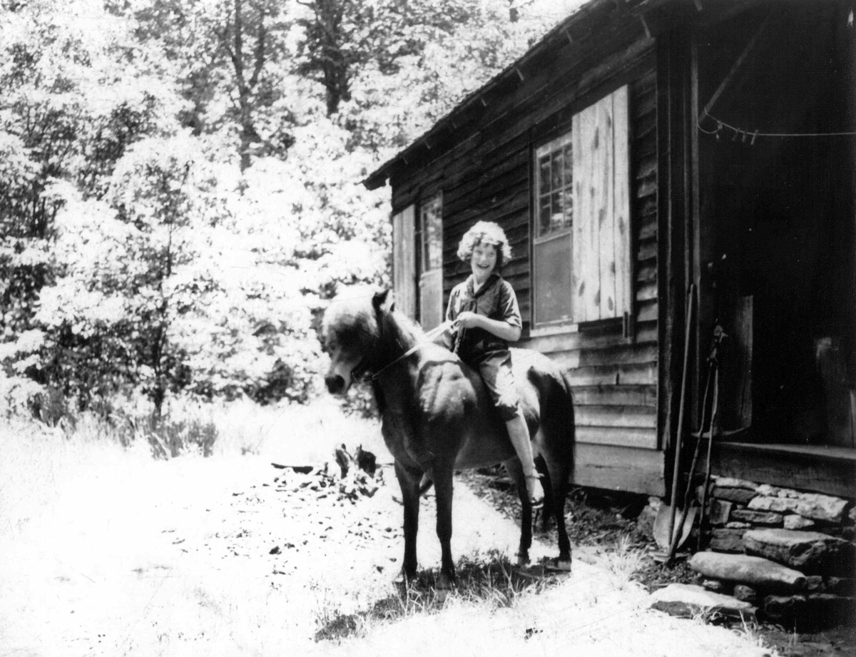 Photo of Flat Mountain School. It existed 7 miles from Highlands on Flat Mountain Road beyond the end of today's pavement and to the left. Natalie Georgia Sato, whose home is near the original site, is seen astride a pony beside the school in 1932.